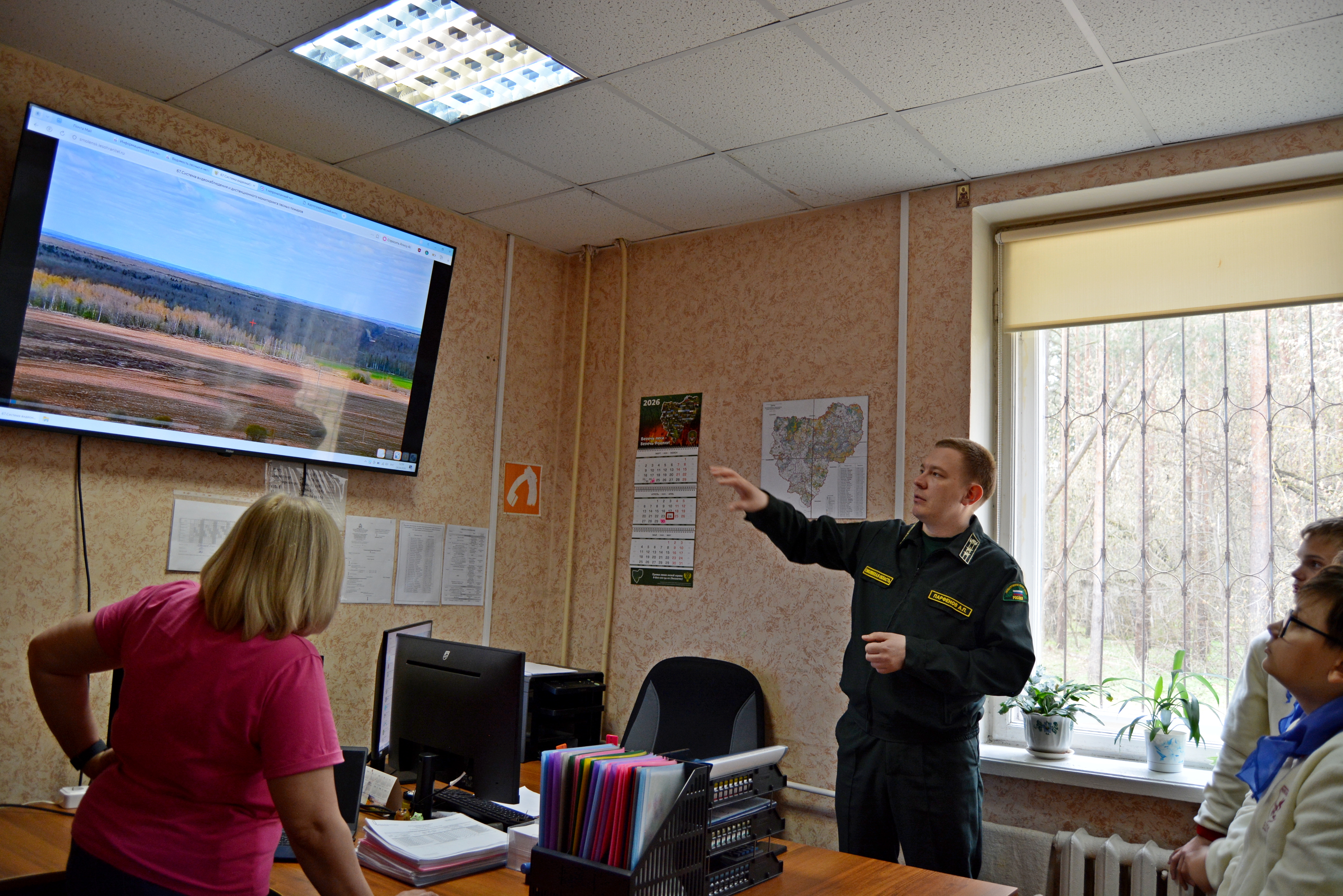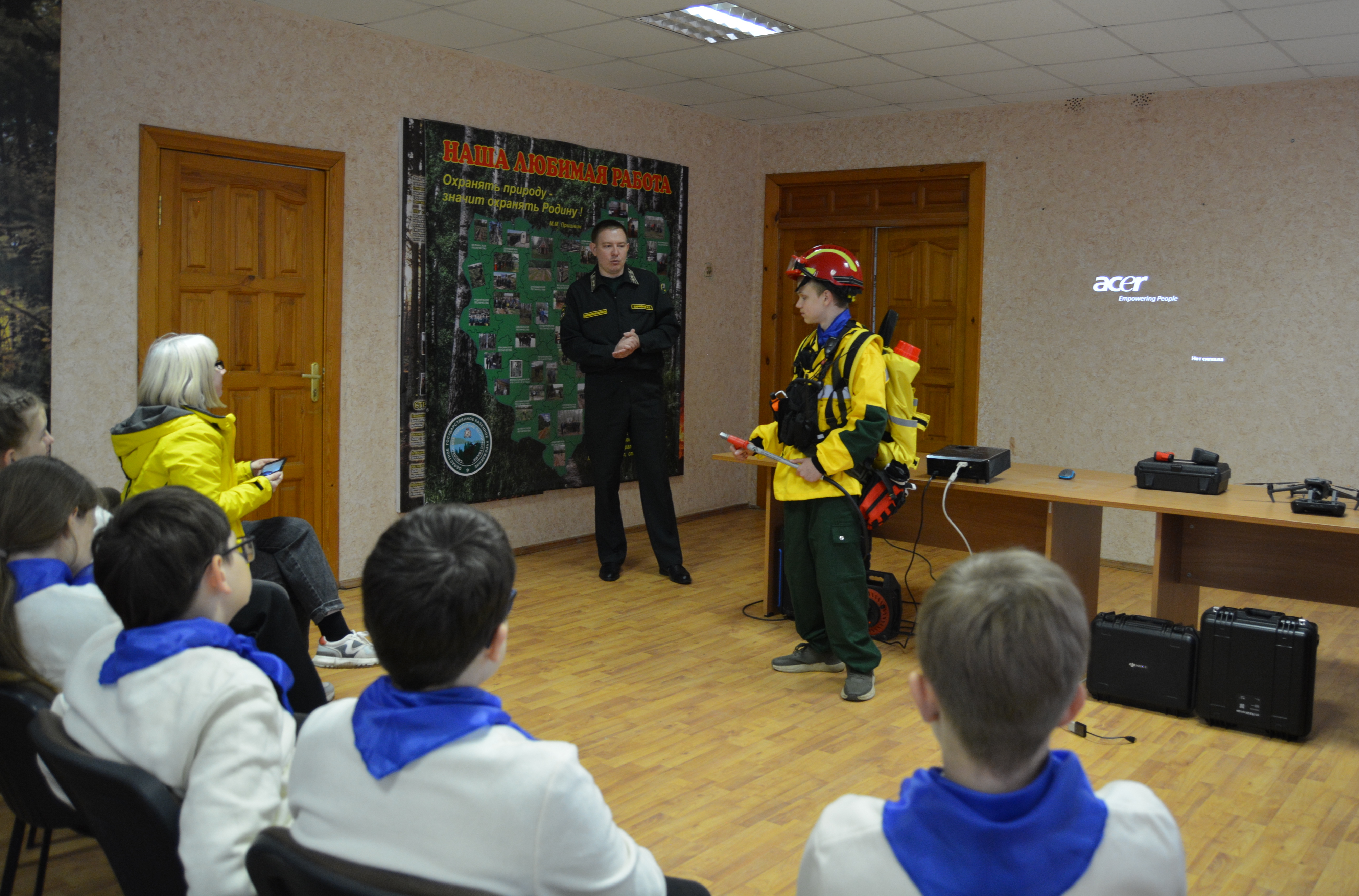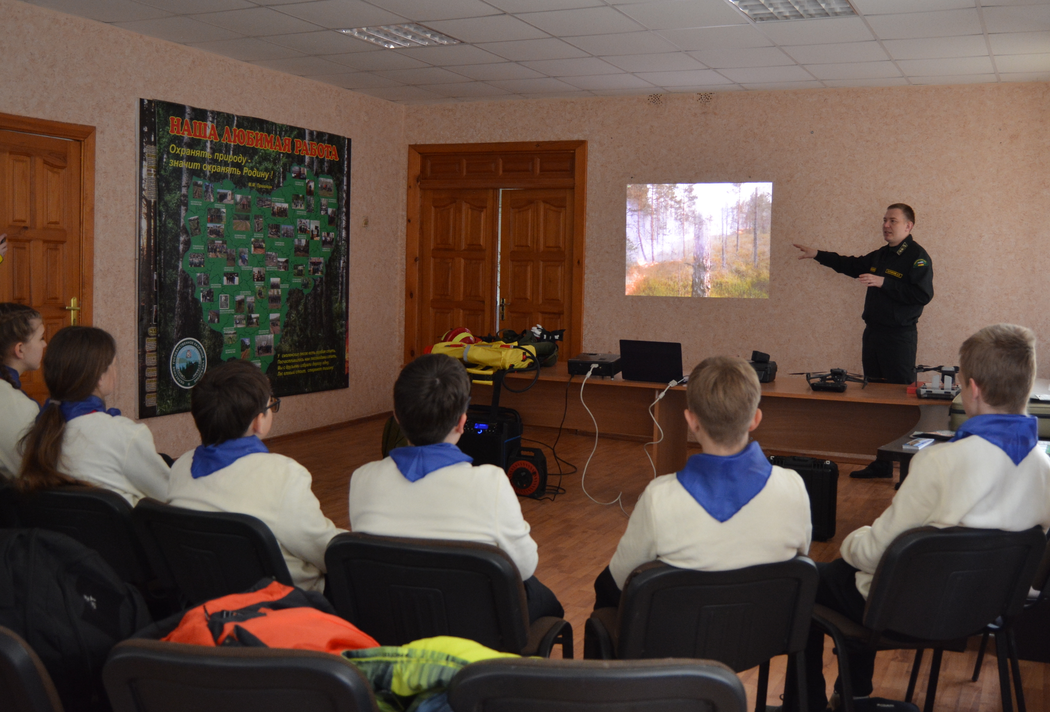 Лесные пожарные провели для гостей познавательное занятие на тему природных пожаров, рассказали об их причинах и способах тушения, показали интересные видеоролики с тушения реальных лесных пожаров, происходивших на Смоленщине. Также ребятам продемонстрировали экипировку лесного огнеборца, объяснили отличия лесных и городских пожарных, познакомили с работой диспетчерской службы и способами мониторинга пожарной опасности в лесах.